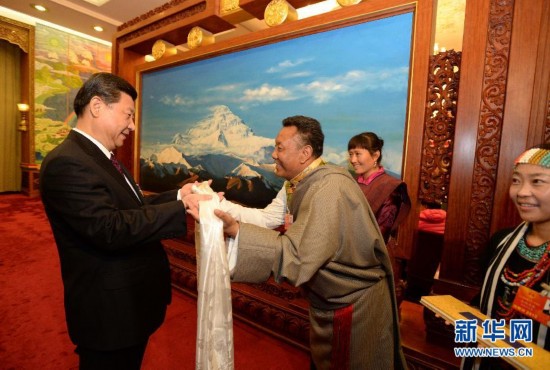 3月9日,中共中央总书记、中共中央军委主席习近平参加十二届全国人大一次会议西藏代表团的审议。这是一位代表向习近平献上哈达。 新华社记者马占成 摄