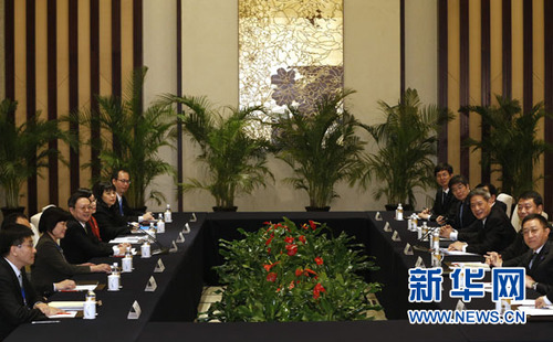 2月11日,国务院台湾事务办公室主任张志军(右三)在南京与来访的台湾方面大陆委员会负责人王郁琦(左四)会面,就推进两岸关系有关问题广泛深入交换意见,并达成积极共识。新华社记者 沈伯韩 摄