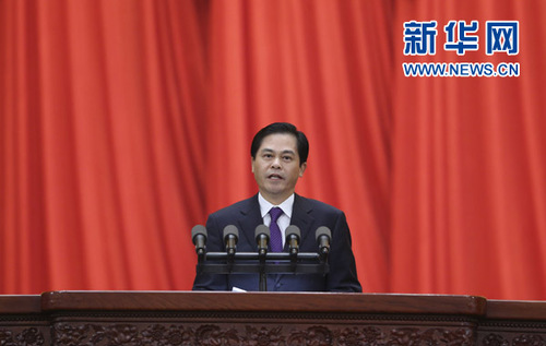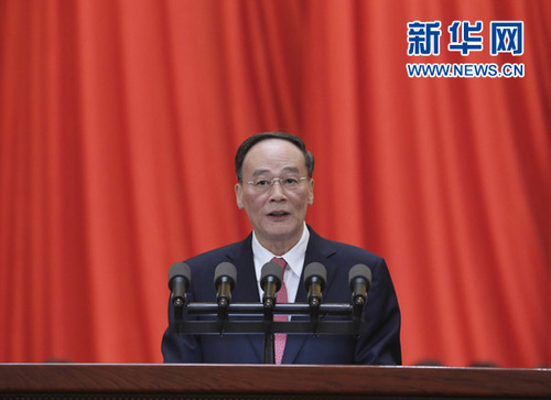 中共中央政治局常委、中央纪委书记王岐山代表党中央发表《在中国特色社会主义伟大实践中撑起半边天》的祝词。新华社记者 丁林 摄