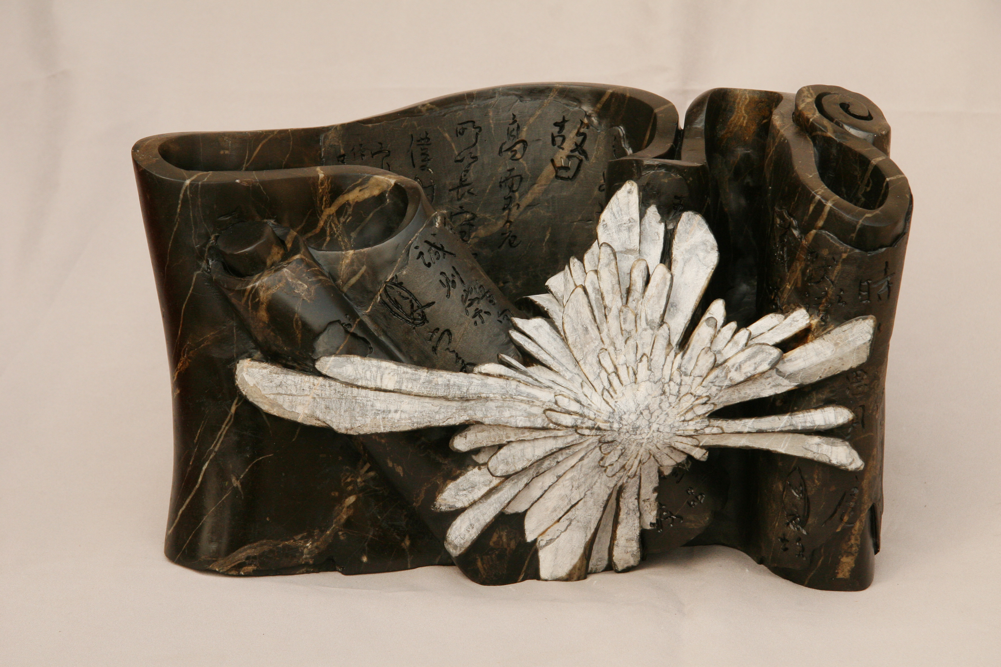 秋日现菊花,清亮、高洁而凄美,为缅怀先人之首选。陶渊明“采菊东篱下,悠然见南山”的隐逸风范更是赋予了菊花“花中隐士”的封号,添了一分宁静的气韵。然花虽雅致却终有衰败的时候,所以当笔者初见菊花石雕之时,便被这洁白莹静之物吸引:是怎样的恩典才能铸就这永不凋谢的凄美宁静!