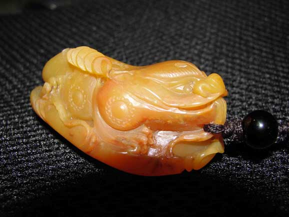 一级黄玉:颜色呈深黄色,柔和均匀。质地致密细腻、坚韧、滋润光洁,半透明状,油脂-蜡状光泽?;疚掮噶?、杂质等。