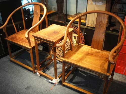例如圈椅,其由搭脑(座椅靠背中央最高处)向两侧方向延伸,顺势而下,与扶手融合成一条弧形曲线。这种所谓马蹄形轮廓是中国座椅独有的优美造型。又如黄花梨木圈椅,此椅大半部与一般椅子结构相似,四根直腿穿过坐展(坐展,指椅子的架上可以取下的部分,一般用棕绳、藤皮、钢丝等编成)直抵椅圈,四隅构成主圈稳定的支柱,椅腿的直线与椅圈的曲线配合上方作小弧度的外仰,靠背板子,两侧的镰把棍(扶手中央的直立木条)都作较大的曲线与扶手处线条配合,使得造型流转顺畅,没有生硬之感。椅腿间近地处的前、左、右三边,连以两根横行木条,上根平直,下根呈罗锅状。