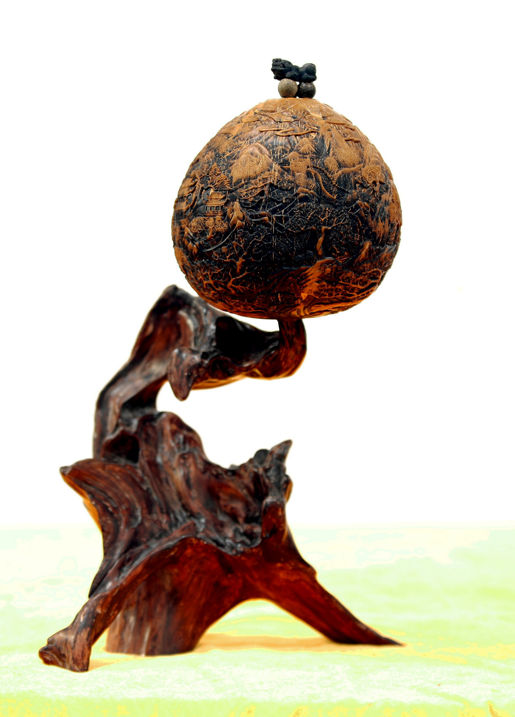 尊重原料本质的生命力并赋予其更深层次的内涵,是判断椰雕作品艺术价值最为重要的一点。吴名驹所创作的《江山如此多娇》,顺延椰子原壳自然肌理的沧桑感,施以浮雕创作的技法,潺潺作画。作品中高山浮云、松柏苍穹叠叠而至,亭台楼阁隐于山间,静谧中既带有室外桃园的惬意闲适,而又没有逃离现实的映射灰色论调。“人”字象形的艺术根雕底座,将整个“江山”托于其上,“以人为本”的寓意为整件作品增添了浓厚的思想性和时代气息。