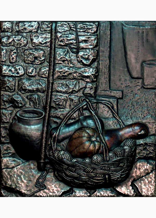 烧色是两兄弟研究出的又一种特殊技艺。郭海博、郭海龙兄弟在补焊被敲漏的作品时发现,铁板随着温度的升高会出现黄、红、紫、蓝等颜色,哥俩觉得如果能将这些天然形成的色彩应用到作品之中就能够彻底改变铁板浮雕色彩单一的局面。经过不懈的努力,他们终于能够掌握这门奇特的烧色技艺。他们逐步将这一技艺应用到自己的作品之中,创作出一系列独具特色的经典之作。其中“太行风情”中十分具有代表性的《秋韵》就是运用了色变技法,画面中有一个竹篮,篮子里装着南瓜、北瓜等果实,这不仅突出了作品的主题,还生动地表现出秋天的乡村所特有的神韵;在画面的左边有一根扁担和一个陶罐,使整个画面丰富起来;背景中的石墙和老屋里的水缸、水桶,让整个画面显得更加和谐,一股浓郁的乡土生活气息扑面而来。