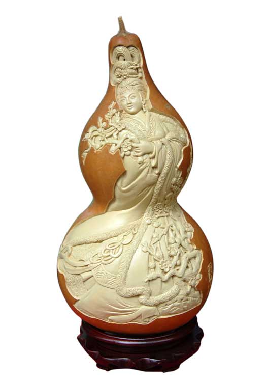葫芦因与“福禄”谐音,所以自古以来就被人们视为吉祥之物。为了寄托良好的愿望,人们经常将其悬挂或陈设于家中的显赫位置,用来辟邪招宝,祈求幸福。长此以往,为了增加葫芦的装饰性,以葫芦为创作对象的工艺品就应运而生,现在算来竟有数十种之多。每个工艺门类都有自己的特点,葫芦工艺也不例外,它是一门“易学”但却“难精”的技艺,其作品大多出于民间艺人之手,由于他们多以历史题材为基础,全凭纯朴的感情与直觉去创作,从而彰显出葫芦特有的美感。