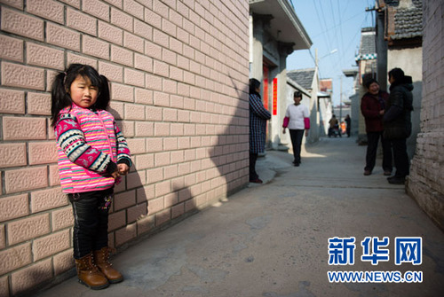 2月15日,5岁的留守儿童余雅育在家门口玩耍。她的父母和爷爷常年在盐城打工,参加完14日元宵庙会之后,他们都已再次外出打工。新华社记者李响摄
