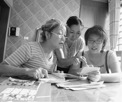 李建珍和婆婆一起向读大学的女儿学英语。