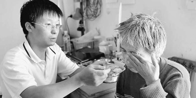 陈斌强在给母亲喂饭。
