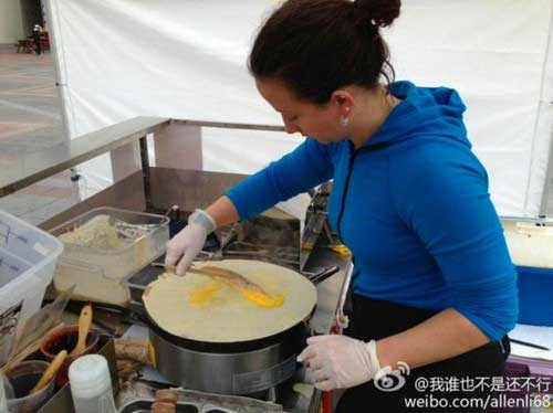 李冠群随后还将自己的这次煎饼果子体验以图文形式发到了国内的新浪微博,该微博迅速走红,引来大批网友围观。网友有的感慨“国际化的煎饼果子立即高大上了”,有的惊叹“吃货改变世界啊”,还有的调侃称,这是中国“国粹”被窃取的节奏吗?不过,还有网友感慨安娜的煎饼果子价格不便宜,一个煎饼果子要7、8美元,将近人民币50元,是国内普通价格的十多倍。为此,安娜向记者解答了中国网友对价格的疑惑。“首先,美国中餐馆菜品的价格一般都比中国的中餐馆卖得贵。其次,在美国经营餐饮的成本比中国要高,比如,市政部门对餐饮经营者有严格的卫生要求,我不能在自己家的厨房准备煎饼果子的原料,还有,在我卖煎饼的几个地方,我每月还得给土地所有人市政部门或者公司支付一笔占地经营费。”