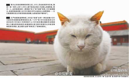 故宫人爱猫,在消防中队、故宫派出所、器物部等办公室,这里的工作人员都在办公室里放有猫粮,宝妈的抽屉里还有维生素、消炎药等各种给猫准备的药物,一些猫还有幸在冬天得到进屋享受一下暖气的“特权”。事实上,作为北京故宫的“猫保安”,它们发挥着自己独特的作用,马国庆科长在接受采访时特别强调,故宫的古建筑除了按照北京市的要求投放鼠药外,这些猫对于老鼠的防治也功不可没,“猫的存在本身就是震慑力。”