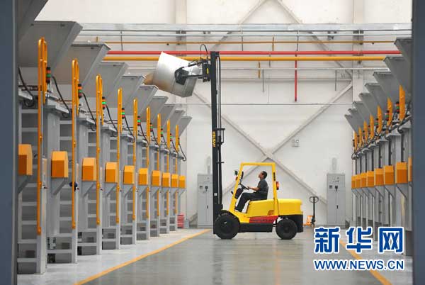 工作人员往位于北京朝阳区循环经济产业园内的高安屯餐厨废弃物资源化处理中心的有机垃圾生化处理机内投放原料(2010年7月28日摄)。新华社记者罗晓光摄