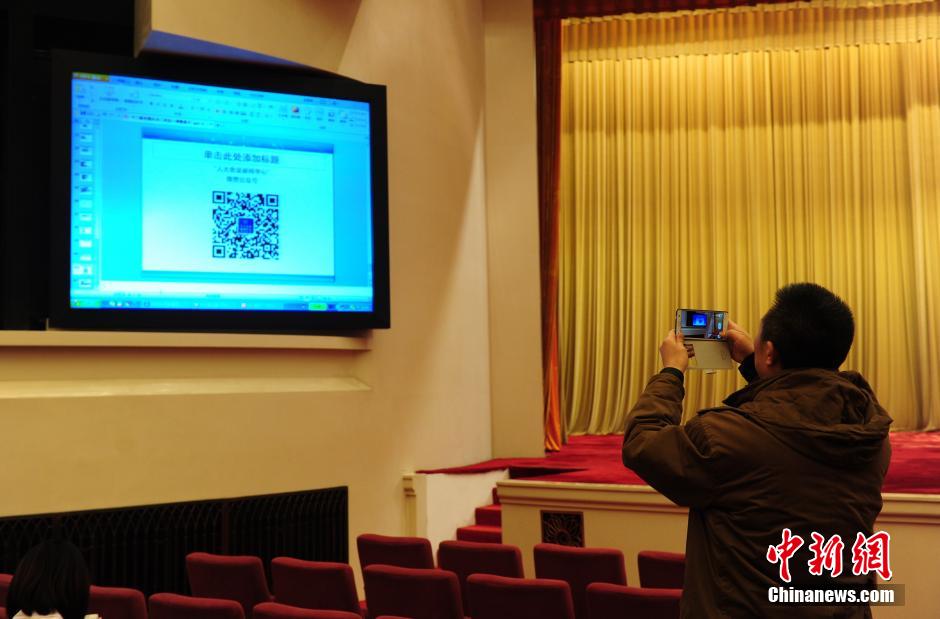 3月1日,一位记者正拿手机关注“人大会议新闻中心”微信公众号。当日,众多记者前往北京人民大会堂内领取全国“两会”证件。中新社发 杨华峰 摄