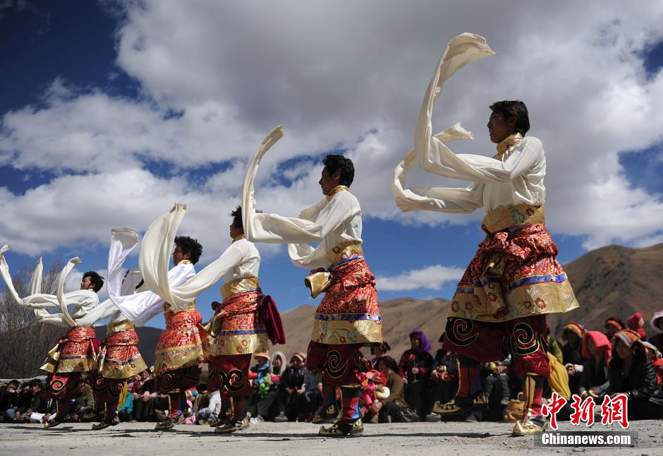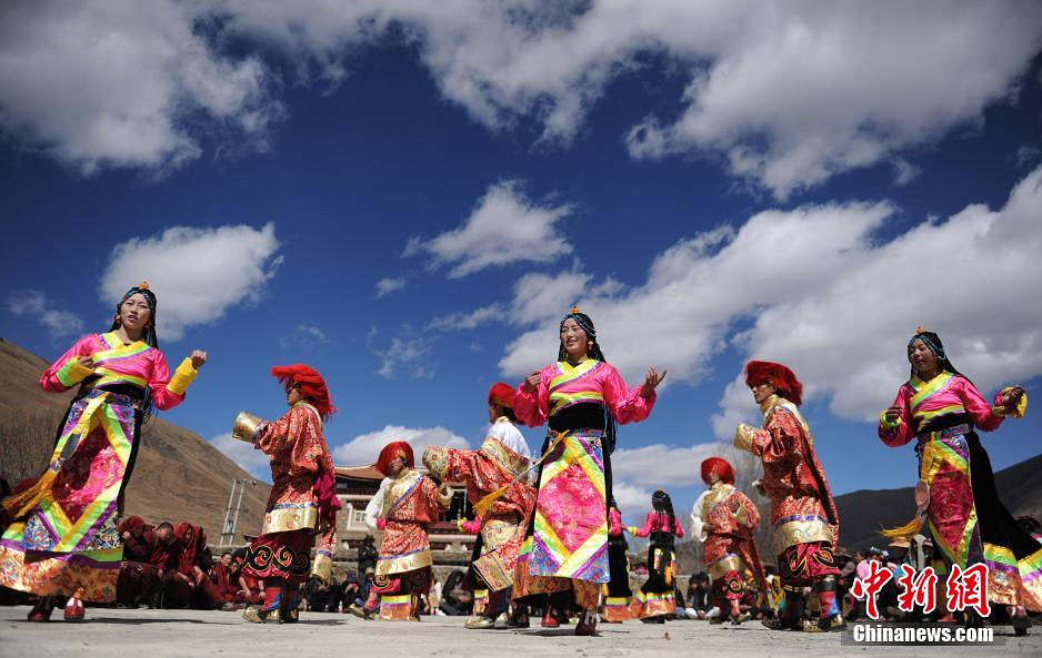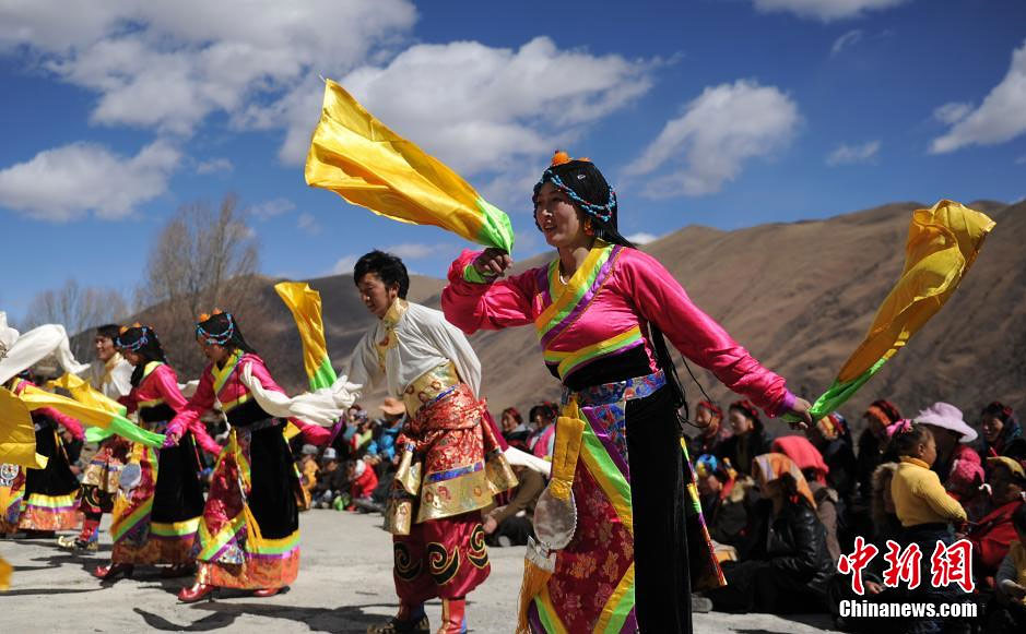 3月1日,四川康定呷巴乡民众穿起漂亮的节日盛装,唱歌跳舞欢度藏历新年。当日,是藏历三十,四川甘孜藏区各地奶茶飘香,购买年货的人们匆匆忙忙,村庄里藏族同胞还跳起欢快的歌舞欢度藏历新年,四处洋溢着节日的繁荣和喜庆。中新社发 刘忠俊 摄