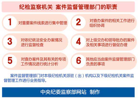 中央纪委监察部网站今日推出“走进中央纪委监察部”系列报道之七:案件监督管理工作,介绍纪检监察机关案件监督管理部门职责等情况。根据介绍,案件监督管理部门履行对重要案件线索进行集中管理、对依纪依法安全办案情况进行监督检查等职责。