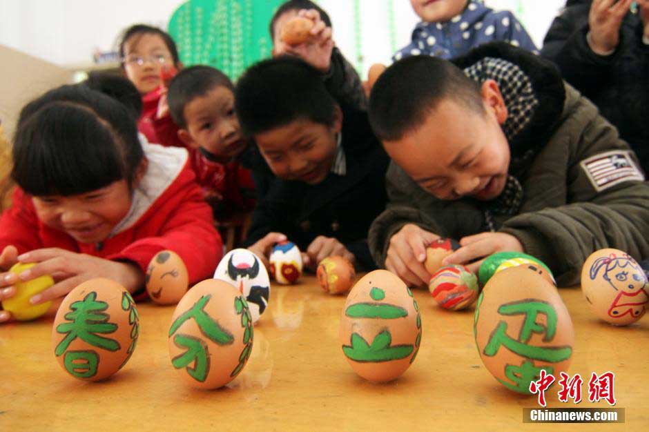 3月21日,江苏常州茶山中心幼儿园的小朋友们在老师的指导下“立蛋”。当日是二十四节气中的春分,春分“立蛋”的传统起源于4000年前,老师通过让小朋友们玩“立蛋”游戏,让他们了解传统习俗,庆祝春天到来。中新社发 陈暐 摄 图片来源:CNSPHOTO