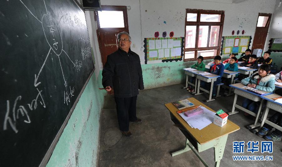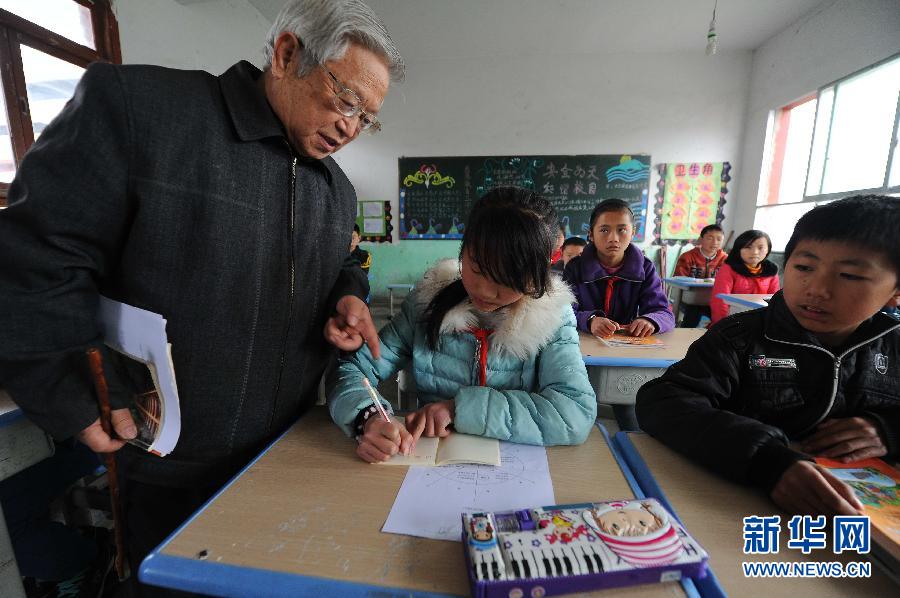 在贵州省遵义市遵义县龙坪镇中心村小学,朱敏才在给学生上课(3月20日摄)。