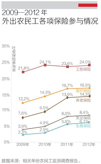 与城镇居民最接近的只有工伤保险参与率。2003年出台的《工伤保险条例》使农民工的工伤保险参与率“表现最好”,2012年为24%,与城镇人口工伤保险参与率(26.71%)非常接近。