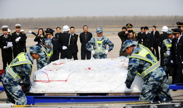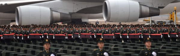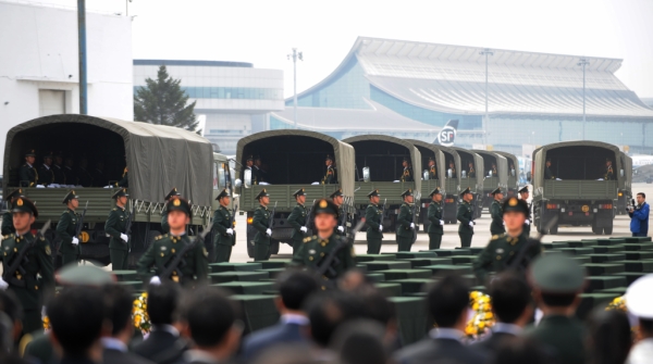 3月28日,搭载437具中国人民志愿军烈士遗骸的专机降落在沈阳桃仙国际机场,离开祖国60多年的烈士英灵回家。