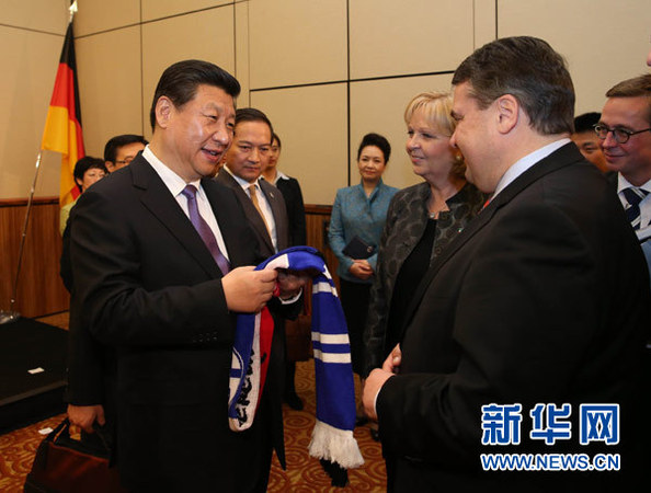 3月29日,中国国家主席习近平在杜塞尔多夫出席中德工商界举行的招待会并发表题为《把握中国机遇,实现共同发展》的重要讲话。这是招待会开始前,习近平在会见中德企业家代表时,德国副总理兼经济和能源部长加布里尔(前右)向习近平赠送一家德国足球俱乐部球迷标志性围巾。新华社记者刘卫兵摄