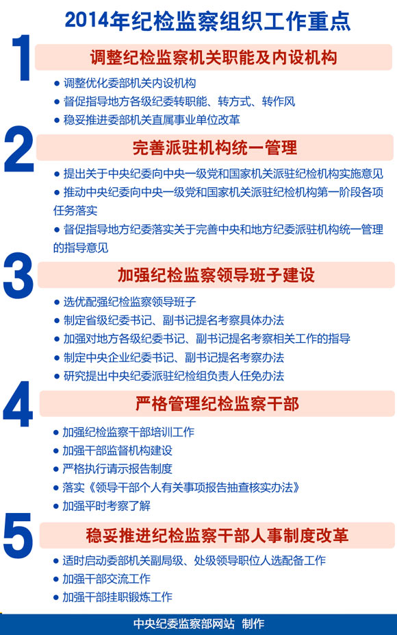 中央纪委监察部网站今日推出“走进中央纪委监察部”系列报道之八:2014年纪检监察组织工作。文章介绍了2014年中央纪委在加强纪检监察组织工作方面的五项重点工作。