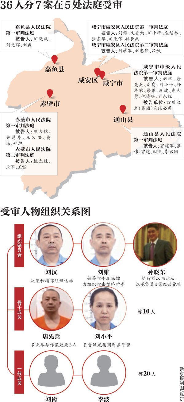 刘汉、刘维等36人涉嫌犯组织、领导、参加黑社会性质组织罪以及故意杀人罪,包庇、纵容黑社会性质组织罪等案件,于昨日由湖北省咸宁市中级人民法院一审公开开庭审理。据新华社