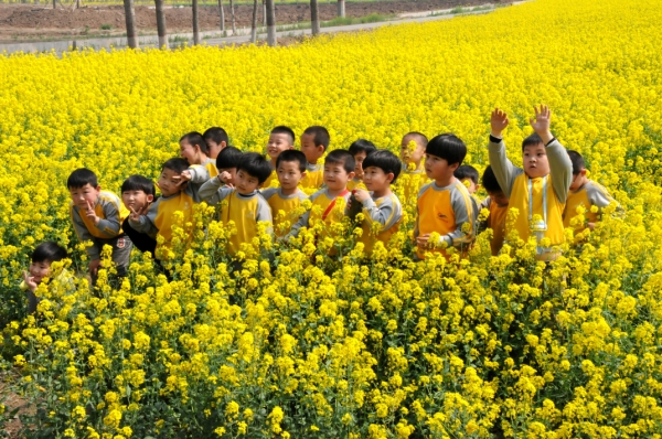 小朋友们在油菜花海里拍照留念