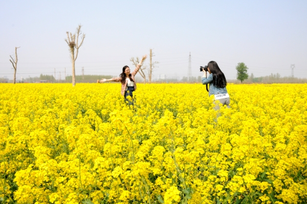 游人在油菜花海里拍照留念