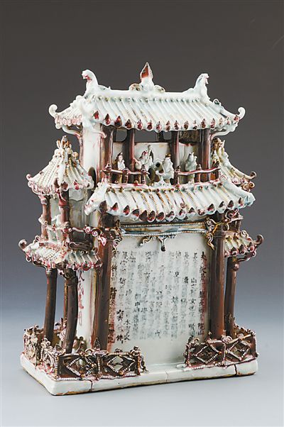 元代景德镇创烧的青花、釉里红等品种在陶瓷史上享誉甚高,其复杂而高超的工艺、精美而透润的特性也在展览中一一呈现,代表作有盖罐、梅瓶、高足杯等。其中,高安窖藏出土的“青花云龙纹兽耳盖罐”高大雄浑,肩部两侧各贴塑模印铺首一只,铺首中各穿铜环,在国内不多见;“釉里红彩斑贴塑蟠螭龙纹高足转杯”的杯与杯把可自由转动,集多种工艺于一体,被誉为国内外釉里红瓷器之最。元代的“青花釉里红堆塑楼阁式人物谷仓”,由上下两层和中间的活动式仓门组成,造型复杂,烧制难度高。四周门廊上有堆塑人物18个,正面仓门两旁为楷书七言对联,背面有白地蓝字墓记一方。这是目前罕见的有确切纪年的青花釉里红瓷器,具有极高的研究价值。