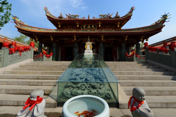 这是台儿庄古城在原址复建的妈祖庙(4月7日摄)。作为京杭运河上重要的水旱码头之一,台儿庄的建筑融合了多种文化元素。