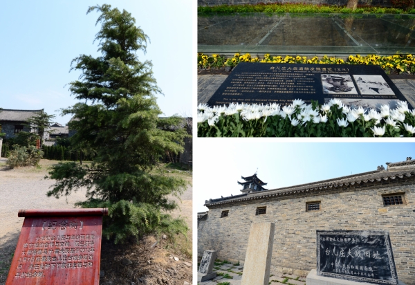 左图:波兰驻华大使塔德乌什·霍米茨基在台儿庄大战遗址栽下的象征和平与友谊的纪念树;右上图:台儿庄大战遗骸发掘遗址;右下图:台儿庄清真寺旁的台儿庄大战旧址文物纪念碑(拼版照片,4月7日摄)。