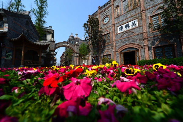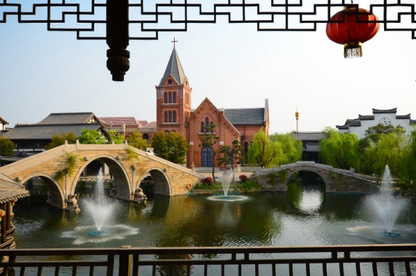 这是台儿庄古城在原址复建的基督教堂及民居(4月7日摄)。