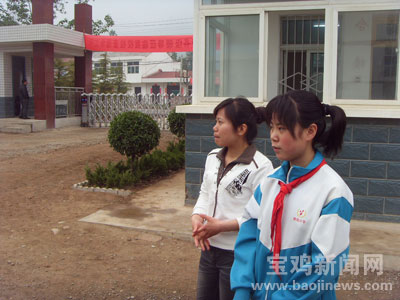 2010年“5·12”大地震纪念日,习近平给陕西太白县鹦鸽镇中心小学六年级学生包俊丽回信,勉励并鼓励之,“多难兴邦,自古英雄出少年”。图为包俊丽(右)在校园内接受采访。