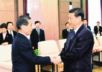 2009年11月,在给山东寿光离岗18年的老县委书记王伯祥的回信中,习近平寄望其“珍惜荣誉、保重身体”。图为2009年12月31日,王伯祥同志先进事迹报告会在北京人民大会堂举行。报告会前,习近平会见王伯祥同志和报告团全体成员并讲话,这是习近平与王伯祥握手。