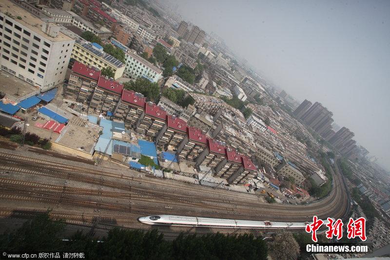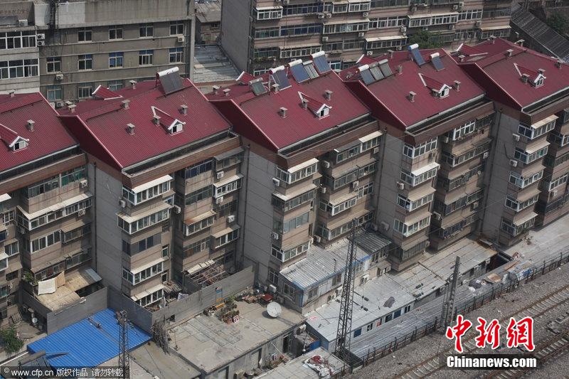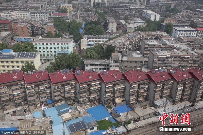 2014年04月26日,山东省济南市,9栋居民楼紧挨在一起看起来酷似“连体楼”,像楼梯一样呈有序折叠形状,吸引众多路人的眼球。图片来源:CFP视觉中国