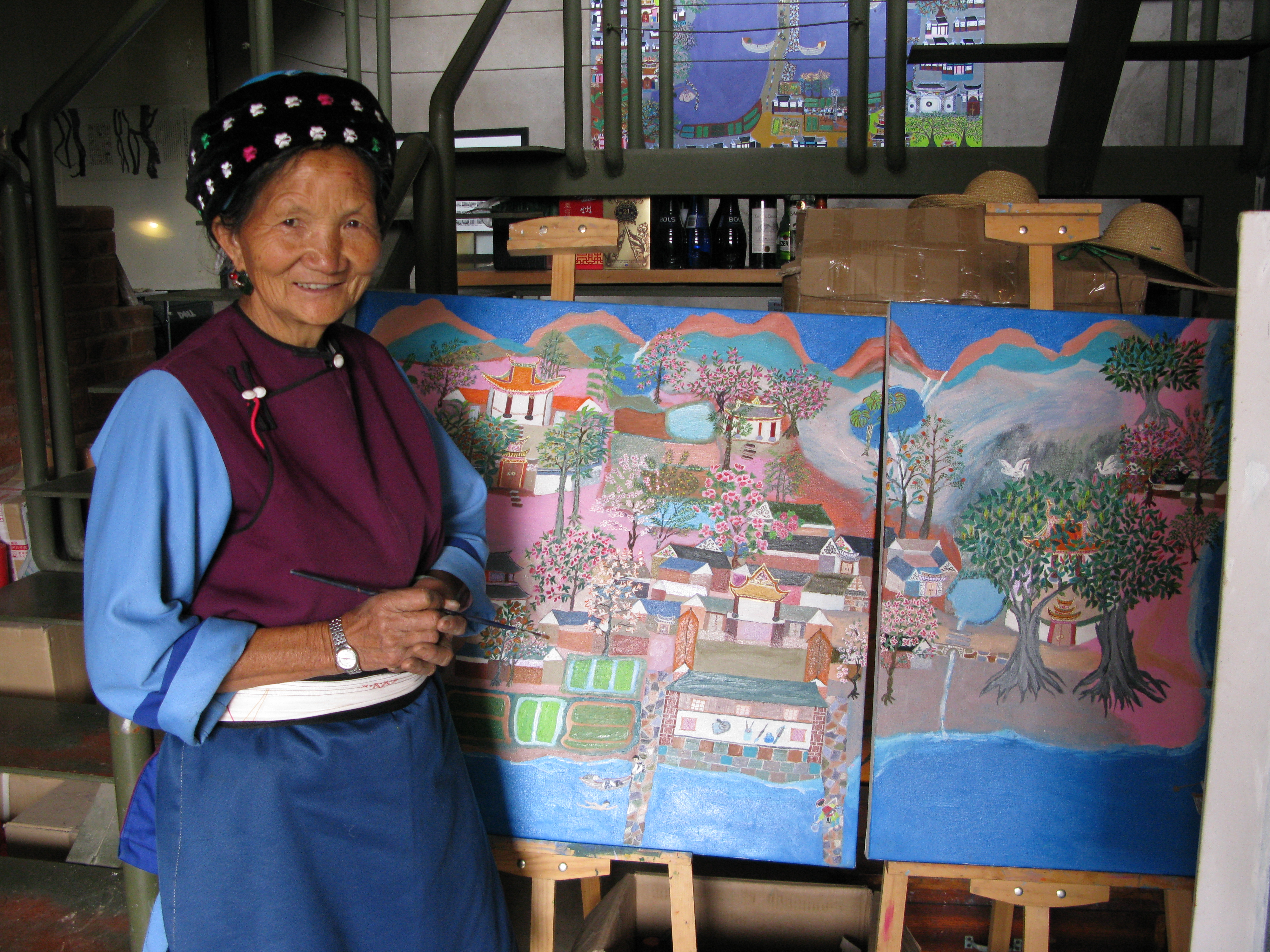 沈老师名字沈见华,是上海的自由画家,以前在上海教书。由于太太身体不太好,想找一处乡村居住,就来到大理双廊。在当地朋友的帮助下,建了“白居”。造房子的时候,他常在一家街边店吃饭,认识了女老板的母亲。这位老外婆当时也有76岁了,看到大上海来的画家,就拿来厚厚的一叠证书给沈见华看,原来老外婆叫王秉秀,十几岁时做过地下党的联络员,后来当过赤脚医生,给很多家庭接生,多次被评为先进。但她连续几年都没有拿到政府的低保补贴,她想请画家帮忙,拿到这个钱。沈见华想了想说:“老外婆,咱们做了一辈子有尊严的事情,到老了更要有尊严,比你困难的人多着呢。这样吧,你来我这里,我教你画画吧,咱们卖掉画,赚的钱比你几年的低保多得多呢。”老外婆很怀疑:“我能画画?”沈见华指着家里的一尊观音像,笑说:“不信,你去问问观音。”我后来访问了老外婆,专门问她怎么问的观音,怎么有了勇气,她很神秘地告诉我,她先是在庙里抓了个签,她不认字,人家告诉她,意思就是:千年思想一时变,于是她下决心好好来画画。她就这样成为第一个学员,拿起画笔第一幅作品就有模有样,画的是《村落》,有房子、树木、花朵、飞鸟。颜色有白族绣衣的味道。