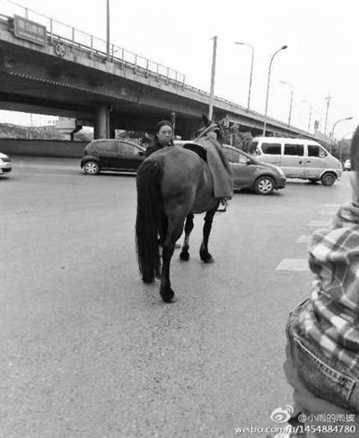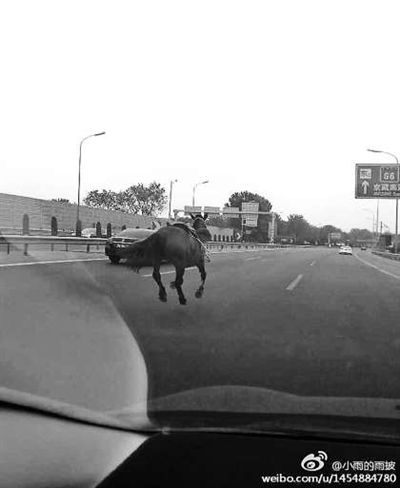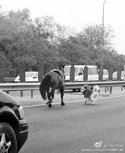 “昨天,一匹马和一条狗成了北五环的“主角”。上午10点左右,一匹带着马鞍的马“溜达”上北五环,虽然主人在后面狂追,众多私家车主试图将其别住,但均因马儿跑得太欢而无果。就在众人一筹莫展之时,一位看热闹车主的爱犬“看不下去了”,它从车内蹿出后直接冲向这匹马。北五环上,一马一狗在前面跑,两位主人在后面狂追,最终在众多私家车主的帮助下,这匹马被截停,这条狗也被主人抱走。”