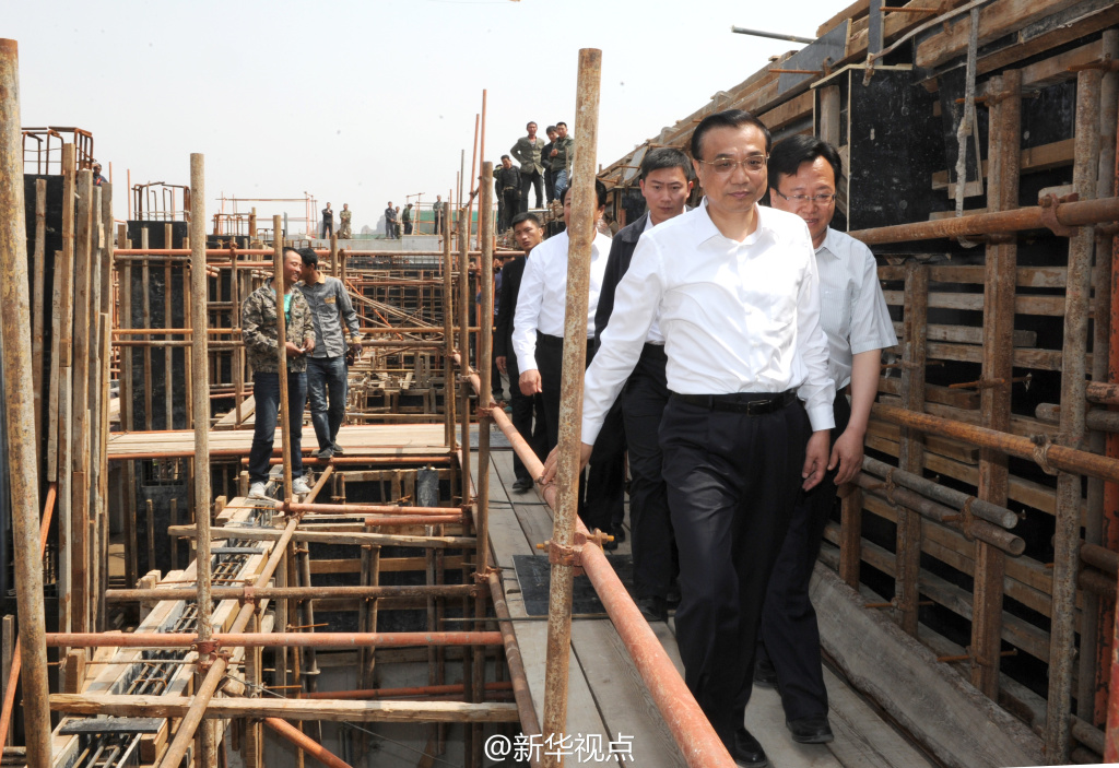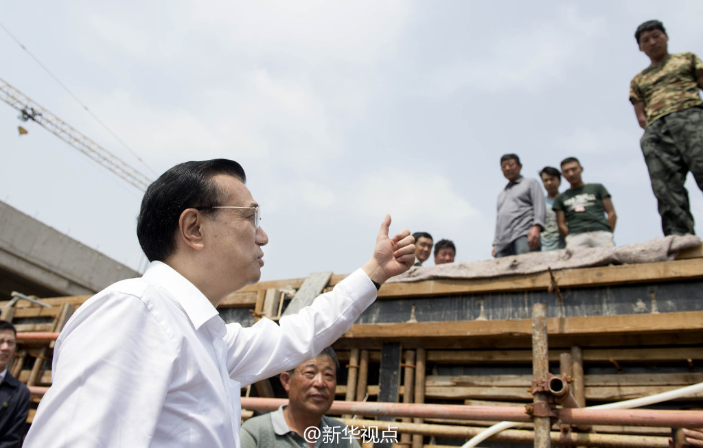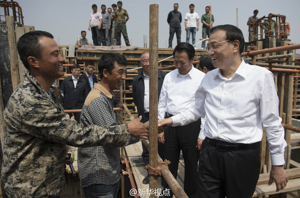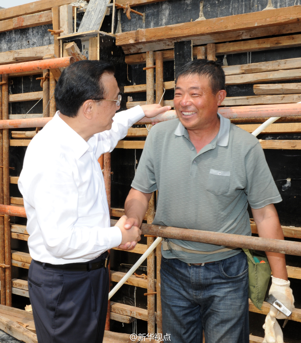 5月22日,在赤峰污水处理项目工地,李克强走上脚手架与农民工交谈。