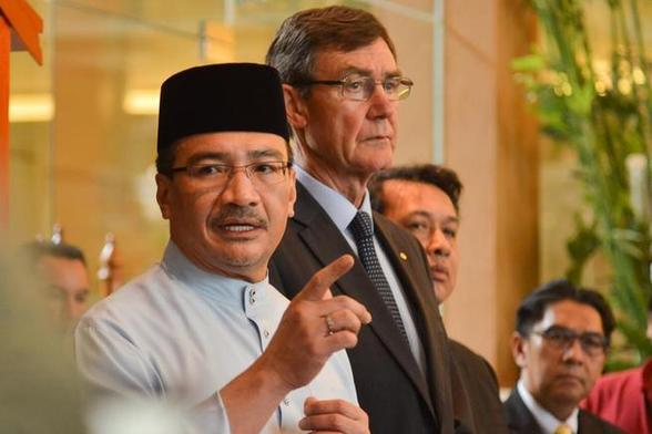 5月2日,马来西亚代理交通部长希沙姆?。ㄗ笠唬┯氚拇罄橇闲髦行淖苄魅税哺袼?middot;休斯敦(左二)在吉隆坡出席新闻发布会。 当日,马来西亚代理交通部长希沙姆丁在吉隆坡表示,他认为搜寻马航370航班的工作处于正确轨道。希沙姆丁还介绍说,他将于4日前往澳大利亚堪培拉,出席马来西亚、澳大利亚和中国三方会议,讨论增加搜寻设备、安抚家属以及专家和技术咨询等事宜。 新华社发(张纹综摄)