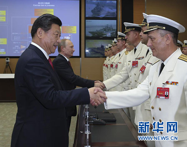 中国中央电视台的画面显示,在一个站满两国军官的房间内,中国国家主席习近平启动了这次演习,俄罗斯总统普京在一旁观看。