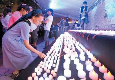 台北捷运江子翠站外5月27日晚举行追思会,一名外籍修女执LED烛光悼念被害人。来源:台湾《联合报》
