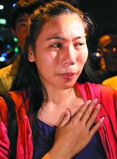 台北捷运江子翠站外5月27日晚举行追思会,一位妇人泪流满面,追悼无辜死者。来源:台湾《联合报》