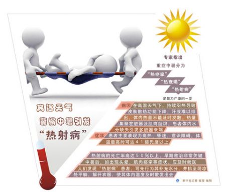 医生提醒大家,千万不要走进一个误区,不是只有长期在大太阳下曝晒的体力劳动者才会患有热射病,年老体弱的城市居民,长期处于闷热的环境中,也有患此病的可能。轻度中暑的症状是恶心、头昏、乏力等。这个时候,要提高警惕,哪儿凉快就哪儿待着。