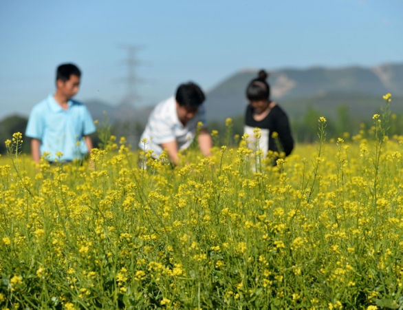 5月28日,在辽宁省朝阳市喀左县六官营子镇,游人在欣赏盛开的白菜花。