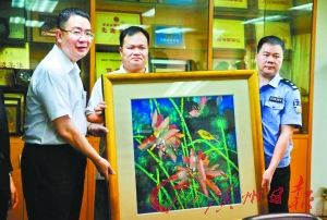 昨日上午,越秀警方将画发还给北园酒家。北园酒家向警方赠送两面锦旗,以示感激。酒家表示,以后要加强防范,藏起一些太贵重的字画,悬挂之时也会将字画向墙壁钉死。