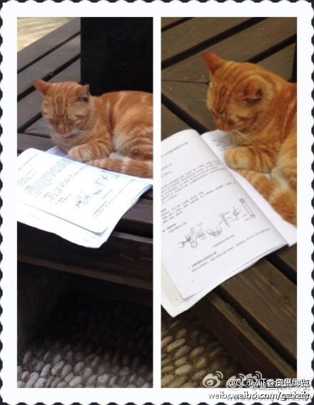 “见过它好几次了,它和其他猫还真不太一样,一点都不怕生,有一次我在那个教室上当代文学导读课,它趴在我旁边的书本上睡着了,老师讲话声音大点时它就抬头看看讲台,看看没事就继续趴下,很可爱,课后很多同学都给它拍照,然后我就成了‘背景帝’。”复旦2011级新闻学院学生戴沛东风趣地说道。