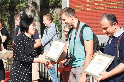 5月26日,北京市人民政府新闻办公室主任王惠为外国摄影师颁发证书。王悦摄(千龙网发)
