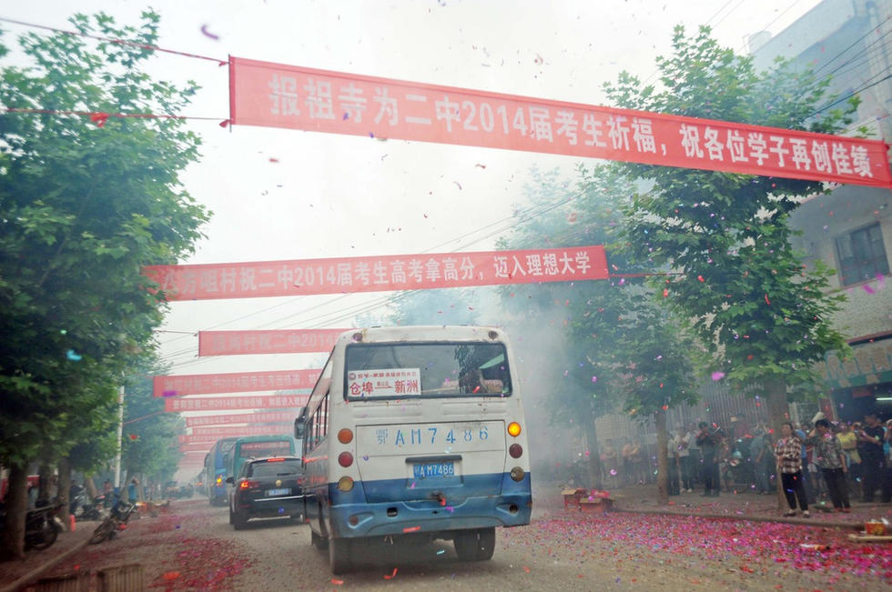 运送考生的车辆依次驶出校门,路边鞭炮点燃,锣鼓喧天。