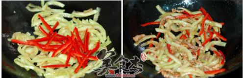 5. 余油再次烧热,倒入挤干水份的西皮翻炒,加入切好的红椒丝