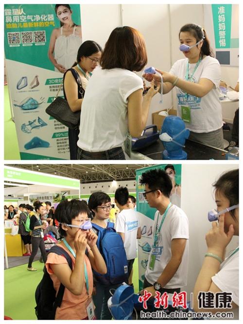 中新网6月9日电 2014年6月6日至8日,MI孕婴体验展在北京农业展览馆举行。一款造型独特、专为孕妇人群设计的高科技防霾装备—霾星人鼻用空气净化器,吸引不少参观者驻足体验。据工作人员介绍,这款防霾装备,采用人脸逆向3D扫描技术,可与面部实现100%贴合,保证99%的过滤效率。