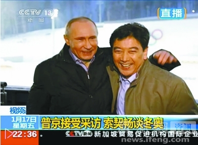 资料图:索契冬奥会时普京受访,拥抱水均益